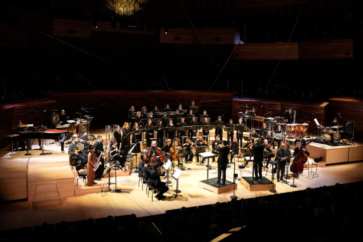 Les grandes manifestations chorales (on se souvient de sa festive Cantate 2024) et les ressorts de l'écriture autant que la liberté de l'improvisation sont à la source du travail d'Alexandros Markeas dont la cantate Les grands Chaos, sur les textes d'Édouard Glissant, est donnée en création mondiale au terme de la soirée. Politique, philosophique et poétique, cette vaste fresque convoque un narrateur (Greg Germain), le « Philharmonique » divisé en deux ensembles qui fonctionnent en autonomie, nécessitant la présence de deux chefs, le jeune Kyrian Friedenberg, ancien assistant de l'EIC et Marc Desmons, chef et alto solo du « Philhar » ; s'ajoutent, de part et d'autre du plateau, le quatuor de jazz Carton rouge (trois saxophonistes et un batteur) et en fond de scène le chœur mixte de la Maison ronde : beaucoup de forces en présence donc et autant de trajectoires sonores qui se croisent, se contredisent ou s'amalgament. Bref, un chaos que le compositeur appelle de ses vœux, « une sorte de paysage mental fracturé » selon ses propres termes, qui nous plonge dans le chaos-monde de Glissant. Fusionnant avec l'orchestre dans des réactions en chaines très explosives, les jazzmen brodent également sur la voix du narrateur. La masse chorale n'est pas en reste, intervenant par vagues bruyantes dans des moments de paroxysme sonore ou flottant au-dessus du texte, « parole tremblante, brisée, poétique », nous dit le compositeur : une manière immédiate et frontale d'opérer avec la langue éruptive de Glissant qui met peu de distance avec le texte et bascule trop souvent, à notre goût, dans le pathos.