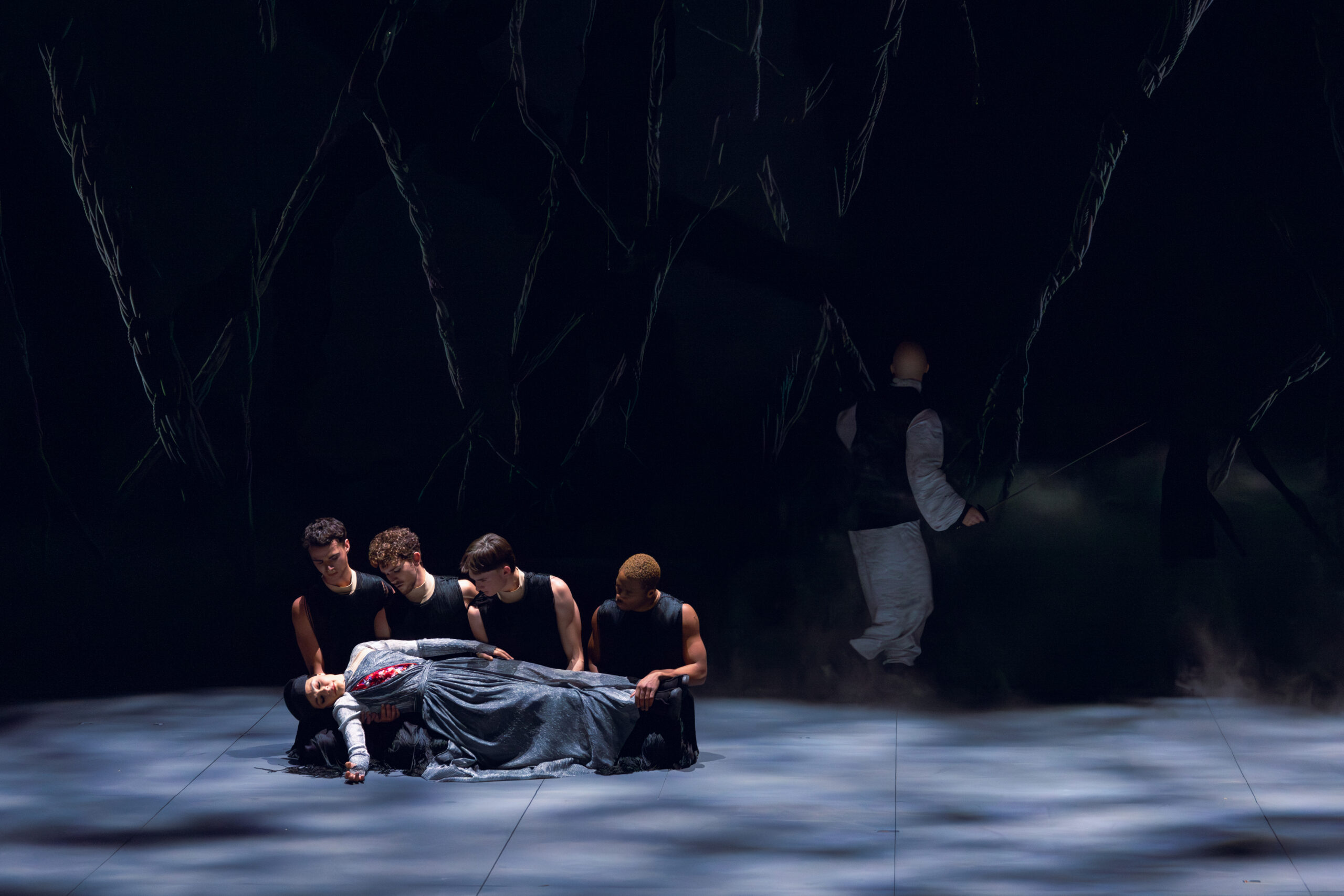 Dans le dernier acte, la vengeance ourdie par la déesse et le roi contre les deux amants Atys et Sangaride se déchaîne dans des éclairs qui zèbrent les racines profondes et sombres du décor. Ensorcelé par la déesse, Atys tue sa dulcinée d'un coup d'épée furieux. Retrouvant la raison il découvre le corps de son amante et la pleure, dans le célèbre « Atys fait périr ce qu'il aime ». Devant ce triste spectacle, puissant acteur dévoré par la souffrance, Matthew Newlin est un Atys bouleversant.