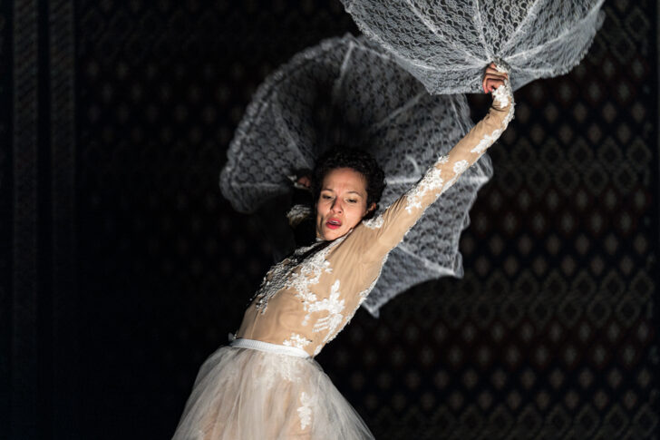 Point n'est besoin de connaître le film pour apprécier l'immense poésie de cette version chorégraphiée. Mais pour les connaisseurs, on y retrouvera avec joie, certains tableaux du film comme ces nonnes aux ombrelles, ces prêtres en robe de bure, ces livres grimoires étalés sur la scène, cette échelle récurrente dans le film, ces tapis kilims qui descendent du ciel, ou cette robe somptueuse d'une femme reine. Les décors, les accessoires, les lumières surtout, sont travaillés avec beaucoup de finesse, et enrobent la danse en prenant possession du plateau avec grande intelligence.