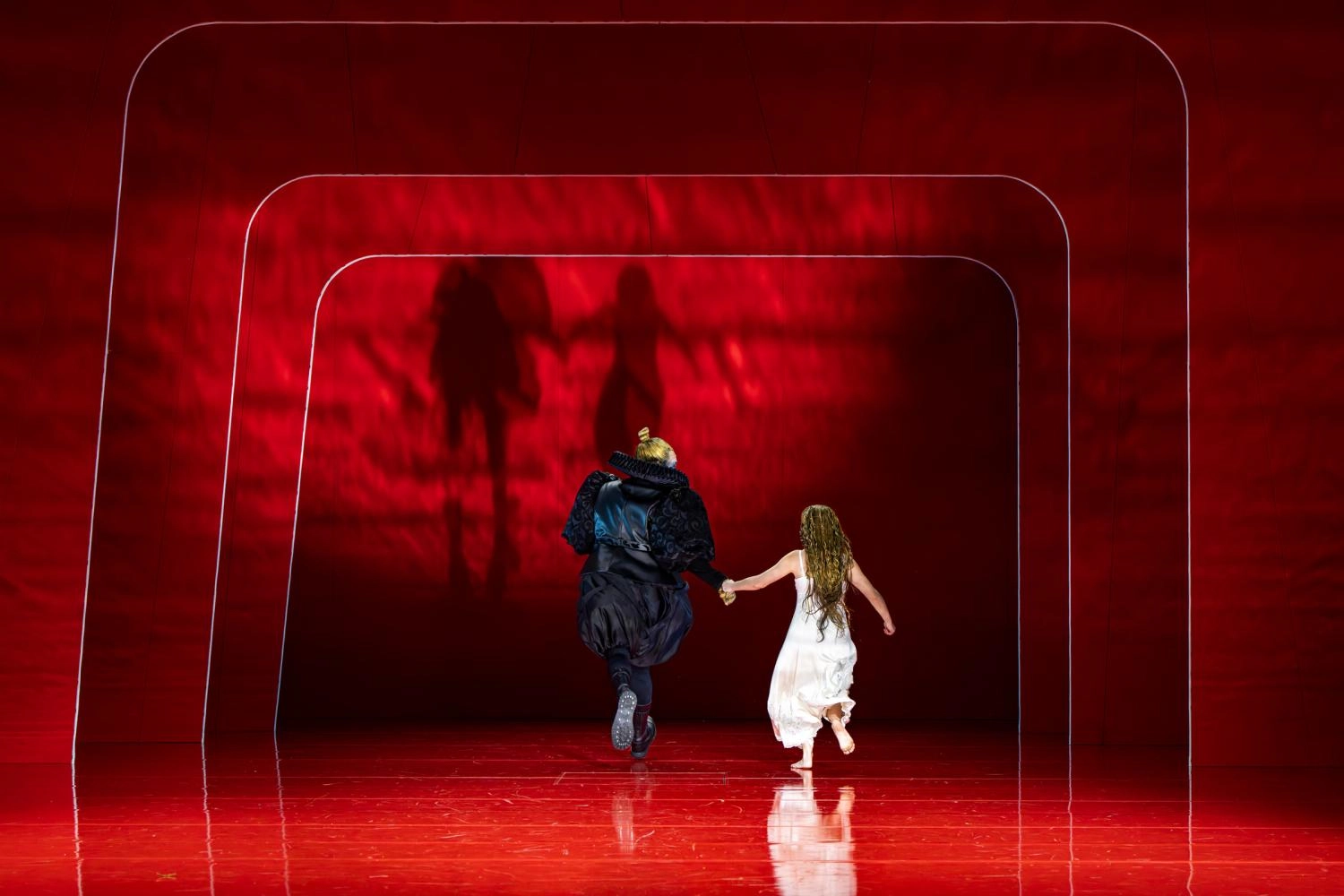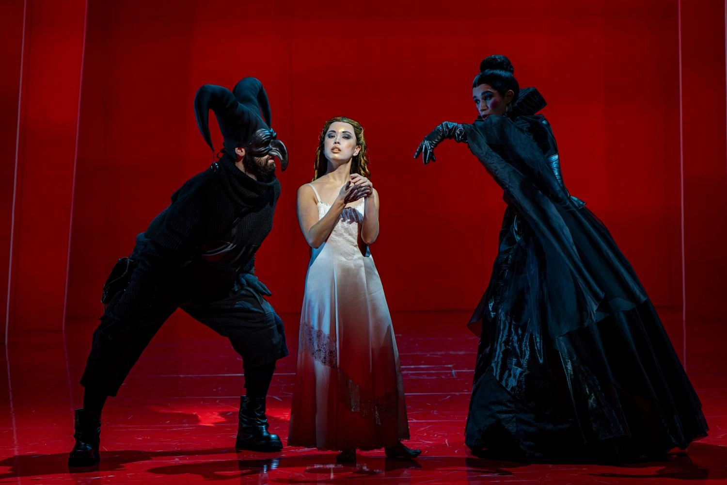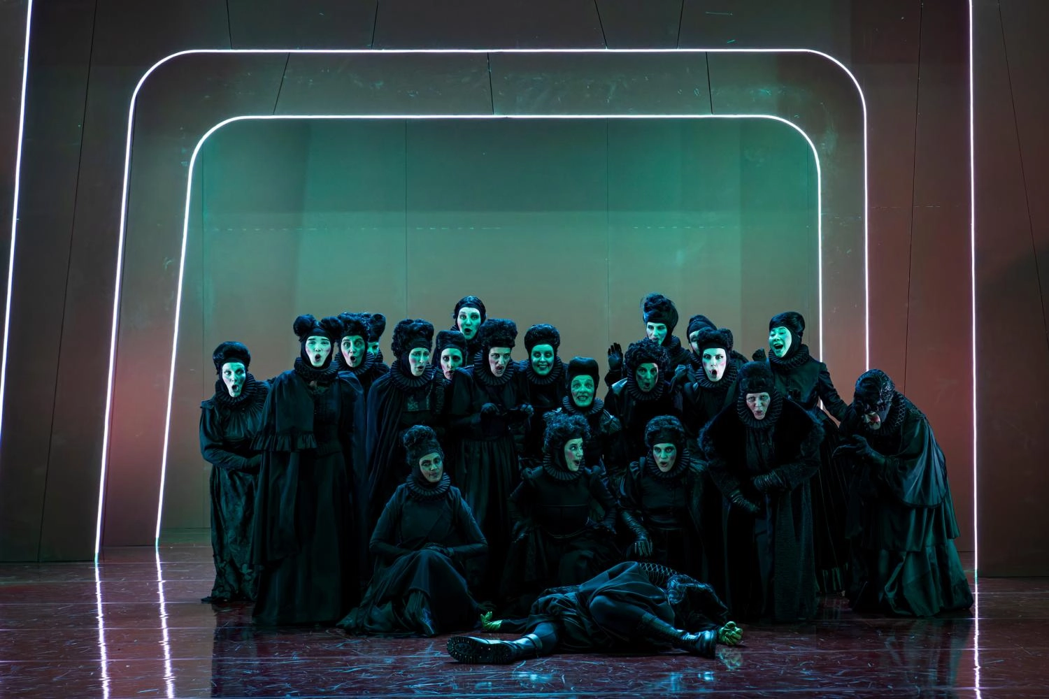 Après le Prélude qui aura permis d'appréhender les couleurs boisées du Sinfonieorchester Basel, le rideau se lève sur l'univers polychrome d' : cette fois l'unique éclaboussure pourpre d'une sorte de castelet dont les cinq coulisses surlignées de tubes fluorescents (celles de jardin, légèrement de guingois, donnent le la de la tragédie décalée à venir) seront prodigues en apparitions et cache-cache de toutes sortes. Fritsch est de ces artistes dont les scénographies peuvent sans lasser investir une unité décorative. Le jeu d'orgues de Cornelius Hunziker, sollicité comme chez le regretté Bob Wilson, assume une part non négligeable de la fascination hypnotique dégagée par le spectacle. Le metteur en scène allemand, qui a déjà monté Macbeth au théâtre, signe aussi la garde-robe, ici d'un noir d'encre, avec des costumes sophistiqués pour tous, chœur compris. Des sorcières, nous ne voyons d'abord que les mains maléfiques avant que leur essaim de corps noirs coiffés comme des apicultrices ne vienne grouiller sur un plateau en miroir, rougeoyant lui aussi aux pieds de protagonistes s'agitant comme des marionnettes autour d'un Macbeth en clown noir, téléguidée par une Lady Macbeth en robe blanche, seule tache de lumière de la symphonie visuelle en rouge et noir imaginée par Fritsch.