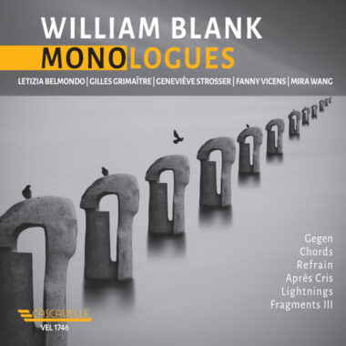 « Monologues ». William Blank (né en 1957) : Après cris, Lightnings pour piano solo ; Fragments III pour violon solo ; Chords, pour accordéon solo ; Gegen pour alto solo ; Refrain pour harpe solo. Gilles Grimaître, piano ; Mira Wang, violon ; Fanny Vicens, accordéon ; Geneviève Strosser, alto ; Letizia Belmondo, harpe. 1 CD Cascavelle. Notice de présentation en français, anglais, allemand. Durée : 68:59