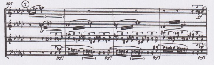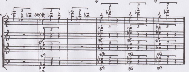 Le dernier mouvement qui annonce comme une cristallisation du matériel thématique reprend le motif initial dans une version altérée, mais dans une atmosphère tourmentée, minée. A peine articulé, le motif est renversé par de violentes secousses :
