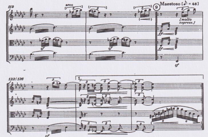 …et, après un galop au rythme pointé, le quatuor débouche sur une accalmie où la cellule descendante du thème s'évanouit dans un pianissimo final. L'amour semble avoir vaincu les forces mesquines, voire destructrices d'une bienséance hypocrite. Ici, la femme adultère n'est plus le rebut de la société comme chez Tolstoï, mais une héroïne digne de compréhension, même de sympathie.