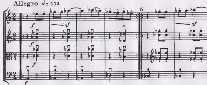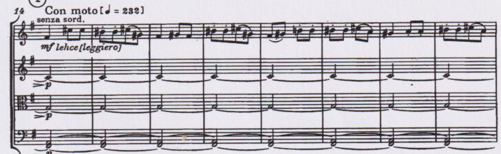 Au début, ce motif est suivi d'une parenthèse à caractère dansant, articulée déjà à la troisième mesure au violoncelle et reprise à tour de rôle par tous les partenaires, avant d'être rappelée plus tard au premier violon comme ostinato :