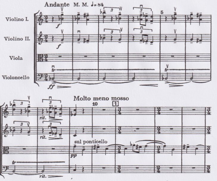 La mélodie de l'amour chantée par l'alto s'introduit de façon discrète, reléguée ensuite d'un instrument à l'autre et mille fois déclinée, entrecoupée par les soubresauts des trilles ou des accords brisés en triples croches prodigieux, une mélodie reprise plus loin dans un dolcissimo espressivo entrelacée d'une charmante polyphonie et lancée finalement sur un parcours dramatique accéléré où les doubles croches et les trilles des violons dans les aigus sur le chevalet annoncent un orage où l'alto et le violoncelle se mettent en quatre pour faire ressortir le thème de l'amour en valeurs doubles.