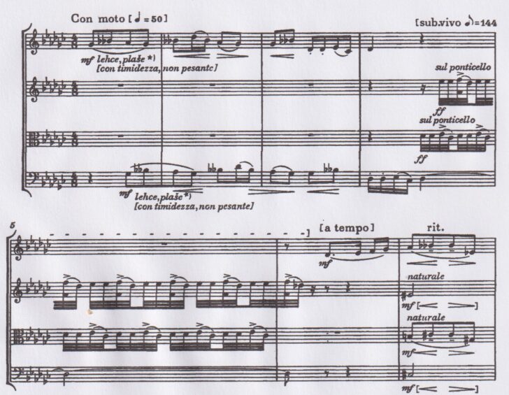 Au troisième mouvement, le premier violon et le violoncelle se relaient dans un canon à caractère lyrique et chromatique (l'amant et l'amante en dialogue ?), une séquence à jouer « timidement », mais bousculée soudainement par les interjections fortissimo aux triples croches sauvages sur le chevalet (sul ponticello), ce qui revendique de la part des interprètes le courage d'émettre des sons stridents. Ce type de contrastes criants entre le ton de supplication et l'éruption fracassante est l'un des traits caractéristiques de ce quatuor :