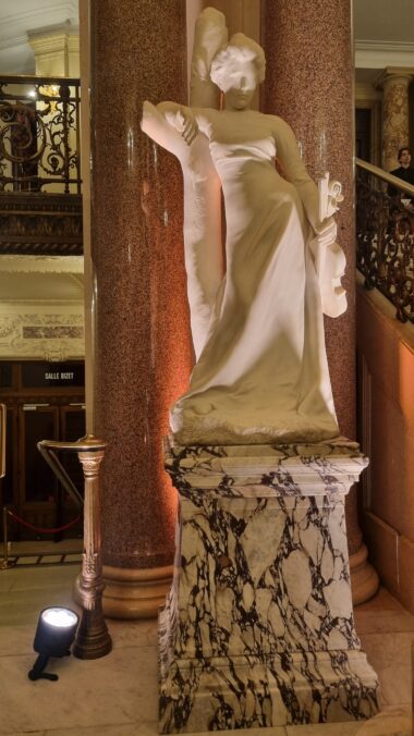 Si la sculpture n'a pas repris sa place initiale aux côtés de « Manon », elle se situe juste derrière « Carmen », au niveau de l'escalier menant à la corbeille. Un socle en marbre dans le style de l'époque a été réalisé spécialement. On peut admirer la modernité qu'elle représentait à la fin du XIXᵉ siècle autant dans la pose légèrement déhanchée, appuyée avec assurance à un arbre, tout en tenant un violon, que dans le costume drapé, en comparaison de « Manon » faisant une sorte de révérence un masque à la main. (NF)