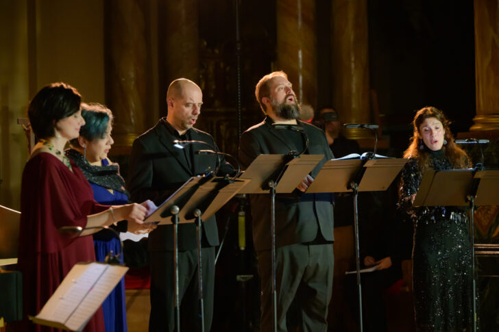 Fondée en 1996, La Venexiana, phalange dédiée au répertoire vocal de la Renaissance et de l'époque baroque, fête ses trente ans. À l'affiche, pour débuter la soirée, des extraits des quatrième et cinquième Livres de madrigaux à cinq voix de Carlo Gesualdo (1566-1613) sur des textes sombres (Guarini et Arlotti), avec la mort comme fil rouge poétique. Le rythme est lent et l'intonation soignée, au sein d'une polyphonie d'une grande sensualité, laissant apprécier la qualité de chaque voix et les hardiesses harmoniques du Prince de Venosa mises au service du mot (sospiro, lagrime, m'uccide…) et de l'expression.