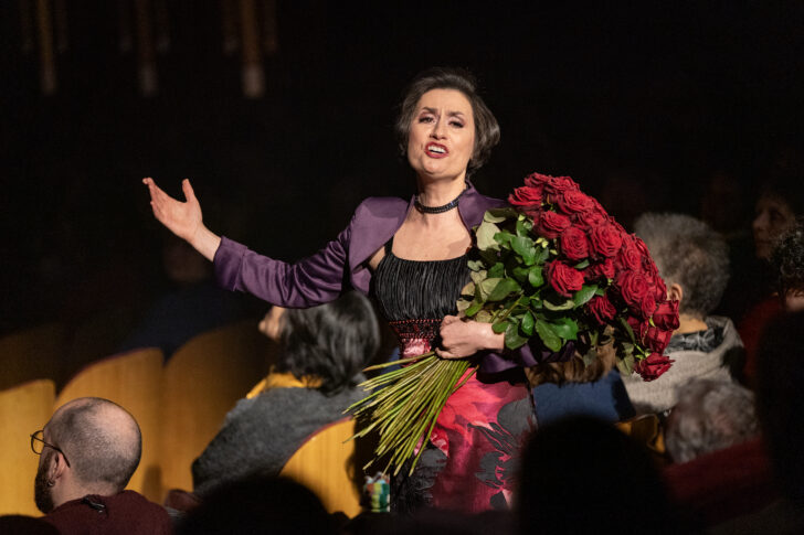 Samedi soir, la Salle Henry Le Bœuf se mue en un espace de transition, presque sacré, à l'occasion du concert Exiles. Au centre de ce dispositif, la mezzo-soprano — superbe tant de timbre que d'engagement — et harpiste Ekaterina Levental porte avant tout le témoignage d'un parcours personnel d'exilée (de l'Ouzbékistan aux Pays-Bas) qui confère à sa prestation une vérité bouleversante. Inversant la dynamique traditionnelle du concert, la soliste entre par le parterre, serrant contre elle un bouquet de roses qu'elle distribuera au public : le spectacle semble commencer par une sortie de scène !