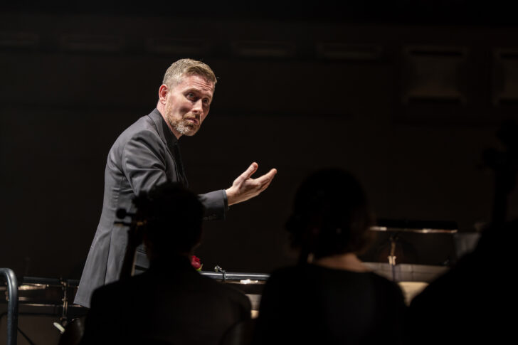 S'installe ensuite, processionnellement, préludée par les harpes soliste et orchestrales – tandis que le chef Geoffrey Paterson s'installe timidement sur le podium, l'obsessionnelle partition de Max Richter, Exiles. Ici, la répétition d'une « base » de huit mesures à trois temps ne stabilise rien et érode nos repères perceptifs par une « désorientation psychologique » où l'orchestre se déploie sans rien perdre de sa vulnérabilité. Même le climax semble s'ouvrir sur un horizon sans fin, sans promesse d'une nouvelle aurore.
