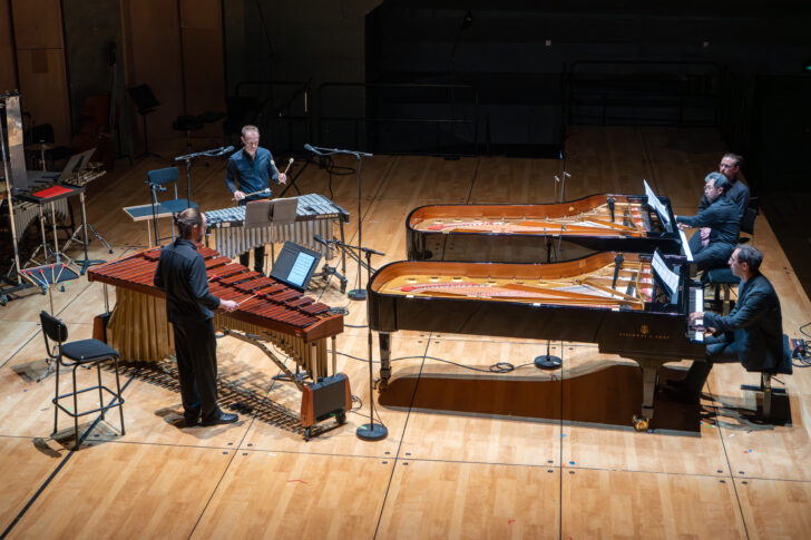 Changement de plateau pour Moscow-Run (2019) : deux pianos libérés de leurs couvercles sont disposés côte à côte, les pianistes dos au public. Ils font face aux deux percussionnistes, l'un derrière le marimba, l'autre le vibraphone. Cette gémellité est utilisée par le compositeur pour « explorer les limites de la perception », cette « zone liminaire où une masse de molécules en mouvement rapide et régulier commence à s'agglomérer pour créer une forme », nous explique-t-il. À l'intérieur d'une écriture serrée et continue, telle un essaim sonore, un dessin mélodique apparaît et se transforme, une rythmicité naît. Colorée de bois et de métal, une texture chatoyante habille cette pièce habilement écrite qui laisse peu de place aux silences, procédant par boucles répétitives propre à la musique minimaliste dans un effet kaléidoscopique des plus subtils.