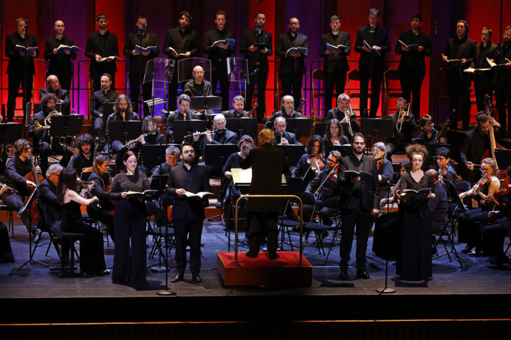 En première partie, le Christ au Mont des Oliviers dépeint un moment précis de l'histoire, la prière du Christ, angoissé et tourmenté au jardin de Gethsémani. Le livret de Franz Xaver Huber relate cet épisode évangélique sans aller au-delà de l'arrestation de Jésus. Nous sommes en présence de trois personnages : Jésus, Pierre et le Séraphin qui incarne la figure de l'ange dans l'Evangile selon Saint Luc. La tonalité rare de mi bémol mineur résonne dès les premières mesures de l'introduction dont la couleur particulièrement sombre des cuivres, puis des cordes, provient des ténèbres. Un vent funèbre semble nous entraîner entre les cyprès et les pierres tombales. Les timbales annoncent le drame inéluctable qui se prépare. Puis le propos se concentre sur un texte profondément humaniste et la portée des mots, sans détailler la longue agonie de Jésus. D'emblée, la direction très sobre de Jordi Savall s'inscrit dans un minimalisme de la gestuelle. Jordi Savall choisit un tempo modéré qui ne traine pas, ainsi qu'une dynamique contrastée, dont les sonorités magnifiées et frémissantes font ressortir les accents dramatiques. L'ensemble est homogène et souple avec une très belle intonation côté bois. Contrairement à la tradition, Jésus est chanté par un ténor, ici Emanuele Tomljenovic, qui incarne ses états d'âme. Voix flexible, articulation limpide avec une ample projection, parfois légèrement couverte par l'orchestre et le chœur, l'expression corporelle est quant à elle parfois figée et peu variée sauf dans les moments cruciaux. La narration souligne chaque passage clé, met en lumière le texte avec puissance. Ainsi les dialogues avec le Séraphin ne manquent-ils pas de corps : la présence angélique de la soprano Elionor Martinez à la voix cristalline apporte grâce et piquant. Pierre, chanté par le baryton Manuel Walser, est le troisième personnage, seulement présent dans deux mouvements. Avec sobriété, sa voix trouve une rondeur touchante. L'équilibre des lignes entre Séraphin et le chœur des anges est admirable tout comme celui des soldats, dont l'épisode de l'arrestation est d'une véhémence de premier plan. Le souffle beethovénien parcourt toute l'œuvre porteuse de lumière dans les parties vocales, jusqu'à ce magnifique final, exaltant, libérateur, qui nous bouleverse par sa ferveur rappelant le choral de la Neuvième Symphonie.