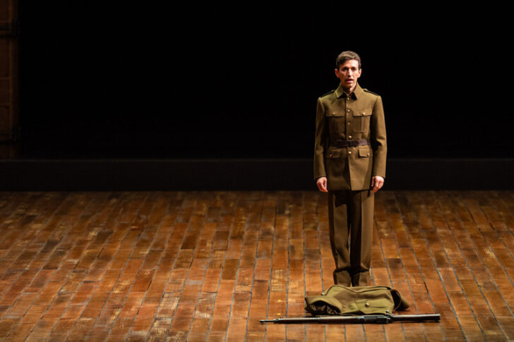 Le champ de bataille du premier tableau n'est donc plus situé dans l'Afrique de la jeunesse de Gandhi, mais dans celui, plus métaphorique, de ce qui ressemble à la salle de répétition d'un théâtre, ouverte sur la bouche d'ombre d'une scène propice aux apparitions. Apparaît un homme en tenue militaire. À peine a-t-il entonné « Je les vois rassemblés ici prêts au combat », qu'on le voit résister au bizutage d'un maître de cérémonie (l'impressionnant Jonathan Friedrickson) professant le pire cours magistral qui soit : apprendre à un homme à tuer un homme. On comprend progressivement que l'homme chantant qui résiste est l'héritier de Gandhi et que l'homme dansant en noir son double négatif. La violence versus la non-violence, cette dernière étant qualifiée par Gandhi de « plus grande force dont l'homme ait été dotée. » Ce n'est qu'au terme de la soirée que sera révélée l'issue de ce combat de l'ange de deux forces qui s'affrontent depuis la nuit des temps et tout au long d'un spectacle d'une puissante intériorité dans son dépouillement même.