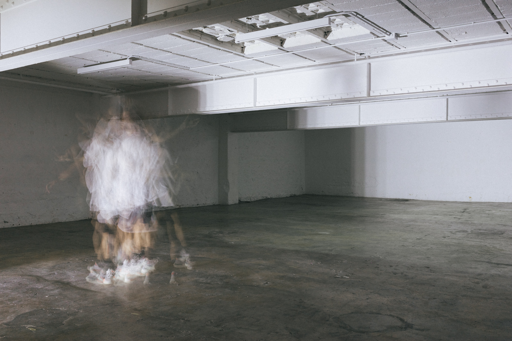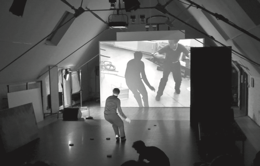 , danseur et plasticien sensible à la géométrie des espaces, vient s'adosser à son double-danseur. Leurs corps dessinent sur les différentes surfaces, en ombres chinoises, des mouvements qui se superposent à ceux des corps-archives surgis du passé.