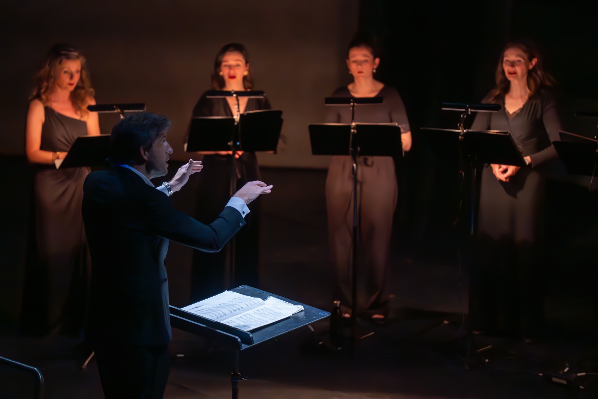 Après le doublé intense Lassus/Allegri, Léo Warynski emmène le public dans des atmosphères sinon plus respirables, du moins plus chargées d'humanité. Tutto in una volta de Francesco Filidei, pièce récente de 2020 et que les mêmes interprètes donnent régulièrement, en 2023 à Vézelay ou l'an dernier à la Cité de la Musique. Et comme ils ont raison, surtout avec la projection du texte fragmentaire du poète Nanni Balestrini (1935-2019). Tout commence et finit par des expirations, qui font progressivement place à « des séries d'accords qui font muter légèrement la couleur à chaque instant dans un kaléidoscope d'images ». Tout s'enchevêtre, les mots ne se finissent pas en phrases, cela se tend vocalement, le chœur féminin est particulièrement exposé, cela ressemble à une histoire d'amour qui va aboutir, ou se casser, jamais on ne comprend vraiment, mais jamais on n'est perdu non plus, il y a de la tension dramatique mais cela n'est pas de l'opéra, et tout retourne au silence. Un temps fort de la soirée, face à Lassus et Allegri, cela donne une idée du niveau de l'œuvre de Filidei.