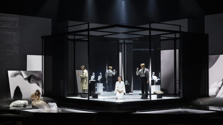 Car pour unique décor de cette nouvelle production, se posent au milieu de la scène les murs de la maison japonaise dans laquelle va inéluctablement s'écouler le drame de Madame Butterfly. Et pour le mettre en image, c'est à Barbora Horáková qu'Aviel Cahn a fait appel. D'apparence, la scénographie (Wolfgang Menardi) et les costumes (Eva-Maria Van Acker) sont classiques, mais ils s'intègrent bien dans le pays du livret par les kimonos, masques ou katanas, leur utilisation étant toujours subtile, jamais caricaturale. Dans des lumières (Felice Ross) plutôt crues ou sombres, les chanteurs peuvent évoluer finement, même si la première scène, avec l'explosion d'une statuette d'enfant devant un kimono rougi de sang, ne laisse aucune chance à l'héroïne.