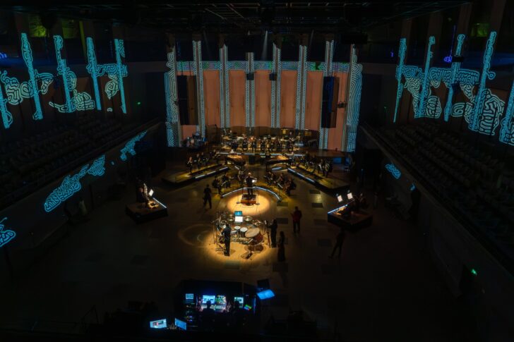 Inscrit dans le cycle des soirées In between, le concert de l'Ensemble intercontemporain mettait l'espace au centre de la problématique sonore, affichant au programme de ce « grand soir », cinq pièces, dont deux créations mondiales, et autant de dispositifs scéniques singuliers.