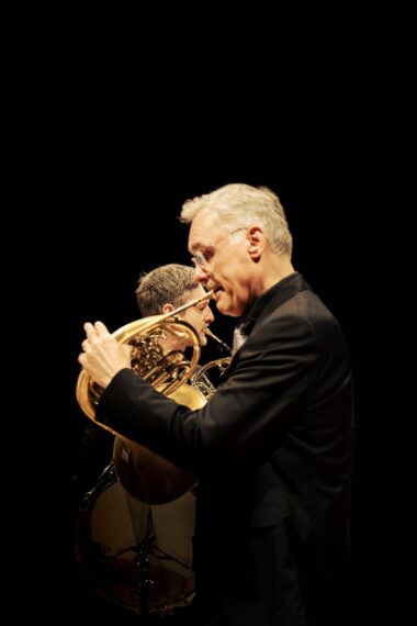 Les deux cornistes et le son circulent dans gla-dya, sous-titrés Études sur les rayonnements jumeaux de l'Italien Marco Stroppa où les interprètes jouent sur la directionnalité du son de leurs instruments en modifiant cinq fois la position des pavillons. La présence de deux caisses claires avec timbre placées entre les cors qui se font face (3) en diffracte délicatement le son quand l'utilisation des sourdines le filtre subtilement (2). Dos tourné au public et pied sur une banquette de piano pour manipuler plus aisément leur sourdine, les deux virtuoses entonnent dans la dernière miniature un joli bicinium (échos d'une musique africaine dont s'inspire le titre de la pièce) qui coupe court trop rapidement.