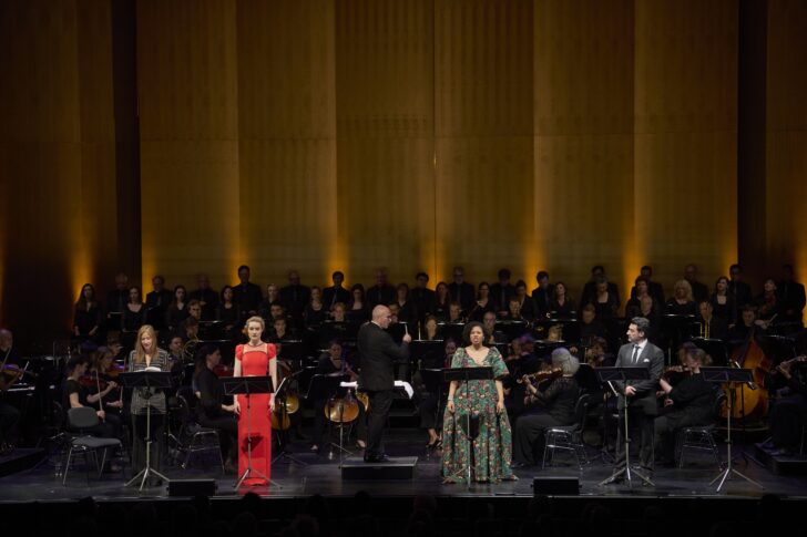 Donner un singspiel en concert n'est pas simple : il faudrait des chanteurs qui soient aussi bons acteurs que chanteurs en allemand, ce qui est difficile avec une distribution internationale, ou bien couper tous les dialogues ce qui serait une amputation, ou encore introduire un récitant qui résumerait l'action que tout le monde connaît. Le choix fait ici se défend : Steppen Kopetzky remplace les dialogues par une narration personnelle du personnage de Samiel (donc, le diable) dans un style poétique pseudo-goethéen, qui n'est ni lourd ni intéressant, et qui fait une transition parfois un peu décousue mais globalement acceptable entre les pièces musicales. Que Samiel soit féminin (Johanna Wokalek est une excellente narratrice) n'apporte ni ne retranche rien à l'histoire.