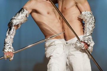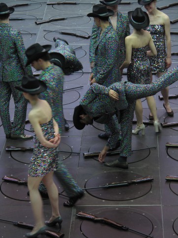 Fusils, costumes à paillettes et guitares électriques sont les ingrédients phares du nouveau spectacle de la compagnie allemande Neuer Tanz présenté au Théâtre de la Ville. Après "Ich sah : ...