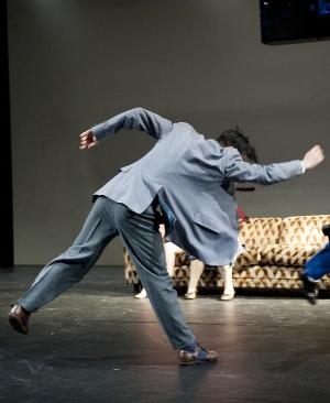 Un décor épuré, avec un plan en bois oblique surplombant une scène claire légèrement inclinée, sert de support à un groupe de sept danseurs qui évoluent au son de la ...